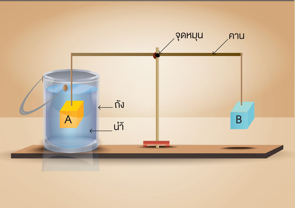 แขวนวัตถุ A และ B ซึ่งมีสมบัติไม่ดูดซับน้ำ ที่ปลายคานเบาแต่ละด้าน และวัตถุ A จมอยู่ในถังน้ำ ทำให้คานสมดุลในแนวระดับ ดังภาพ