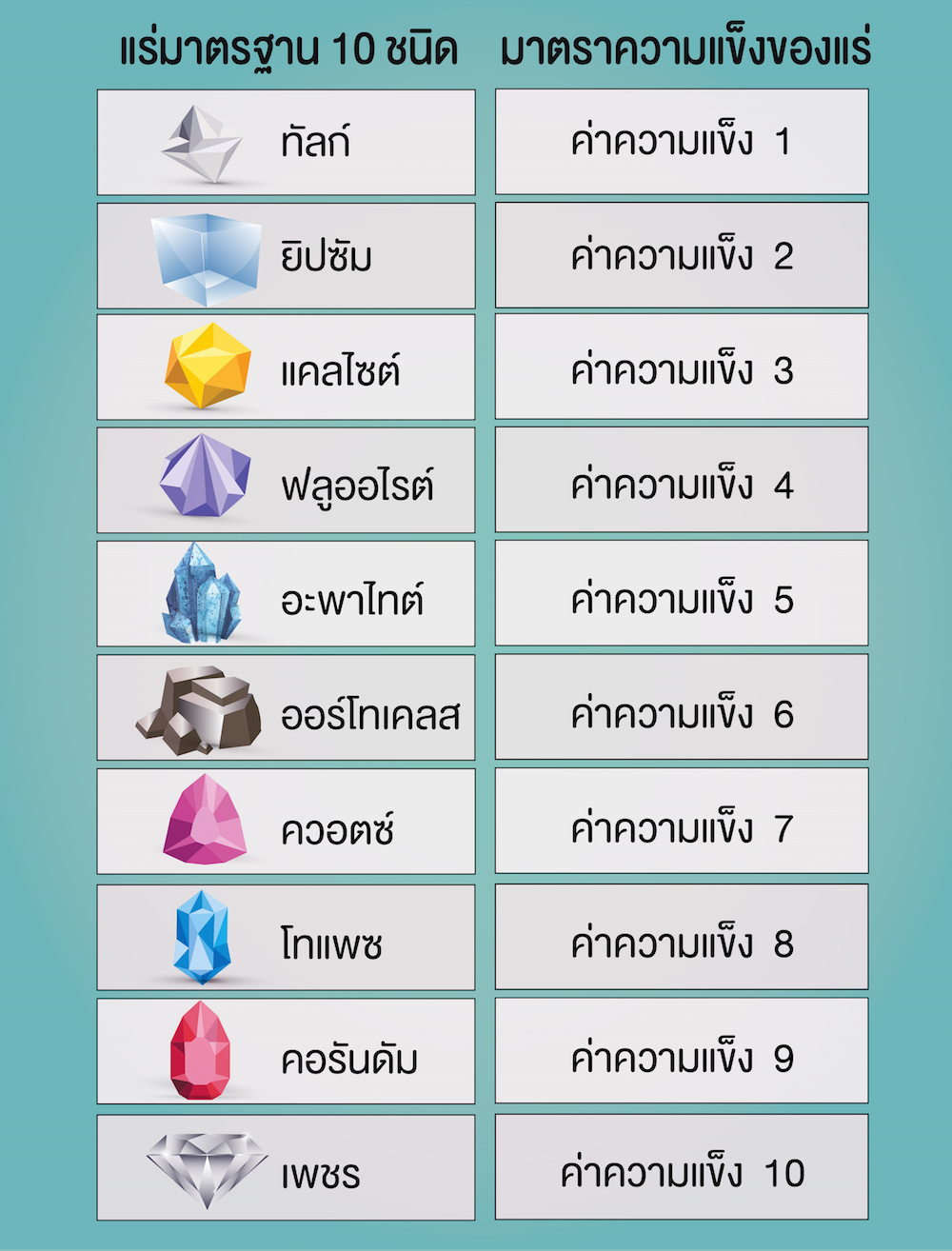 แร่มาตรฐาน 10 ชนิด เรียงลำดับตั้งแต่แร่ที่ทนทานต่อการขูดขีดน้อยที่สุดถึงมากที่สุด ได้ดังนี้